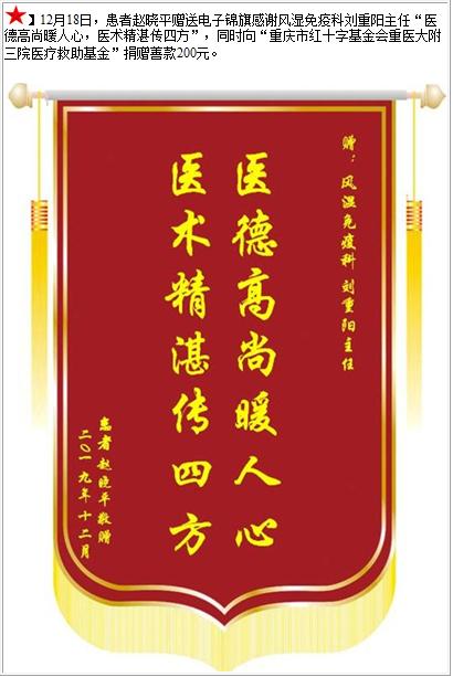 患者赵晓平赠送电子锦旗感谢风湿免疫科刘重阳主任,并向医疗救助基金捐赠善款200元-锦旗-患者心声-患者服务-重庆医科大学附属第三医院【官方网站】