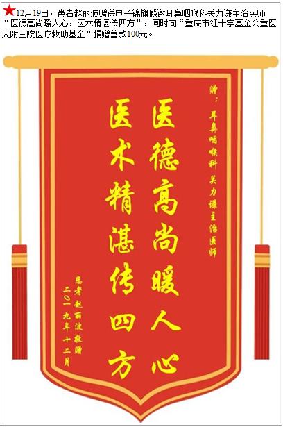患者赵丽波赠送电子锦旗感谢耳鼻咽喉科关力谦主治医师,并医疗救助基金捐赠善款100元-锦旗-患者心声-患者服务-重庆医科大学附属第三医院【官方网站】