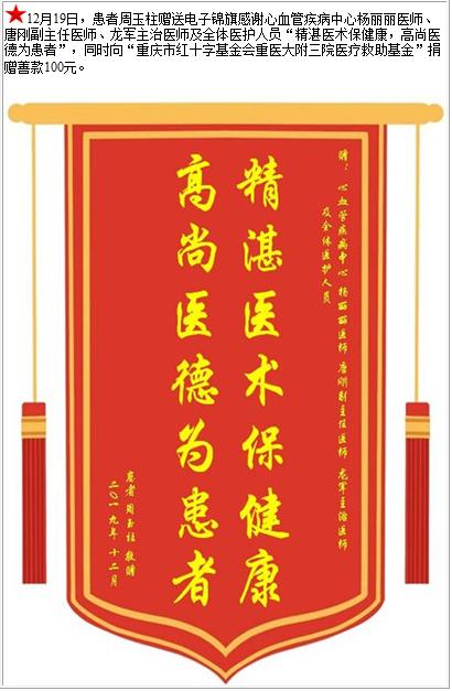 患者周玉柱赠送电子锦旗感谢心血管疾病中心杨丽丽医师等人及全体医护人员,并向医疗救助基金捐赠善款100元-锦旗-患者心声-患者服务-重庆医科大学附属第三医院【官方网站】