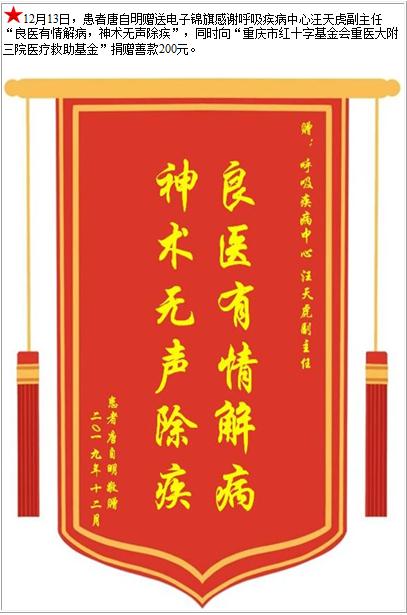 患者唐自明赠送电子锦旗感谢呼吸疾病中心汪天虎副主任,并向医疗救助基金捐赠善款200元-锦旗-患者心声-患者服务-重庆医科大学附属第三医院【官方网站】