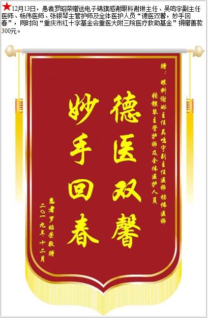 患者罗昭荣赠送电子锦旗感谢眼科谢琳主任等人及全体医护人员,并向医疗救助基金捐赠善款300元-锦旗-患者心声-患者服务-重庆医科大学附属第三医院【官方网站】