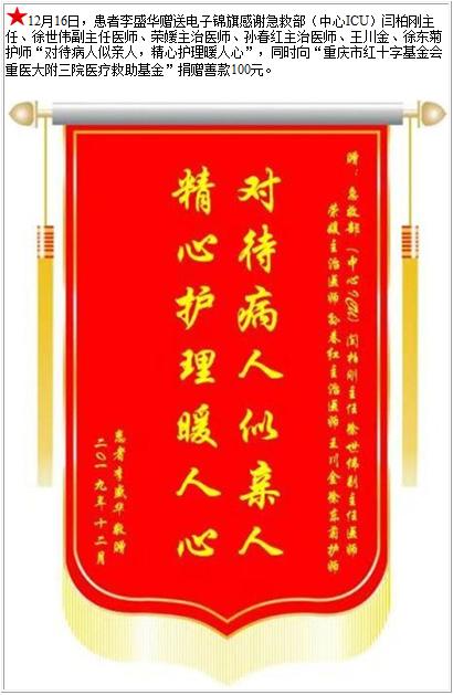 患者李盛华赠送电子锦旗感谢急救部(中心ICU)闫柏刚主任等人,并向医疗救助基金捐赠善款100元-锦旗-患者心声-患者服务-重庆医科大学附属第三医院【官方网站】