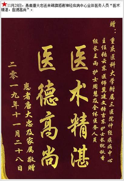患者唐大忠送来锦旗感谢神经疾病中心全体医务人员“医术精湛,医德高尚”-锦旗-患者心声-患者服务-重庆医科大学附属第三医院【官方网站】