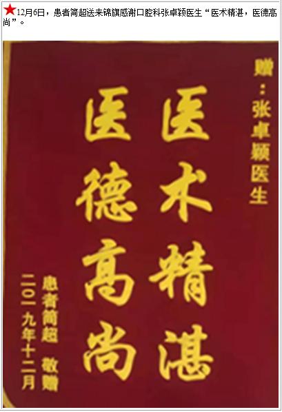 患者简超送来锦旗感谢口腔科张卓颖医生“医术精湛,医德高尚”