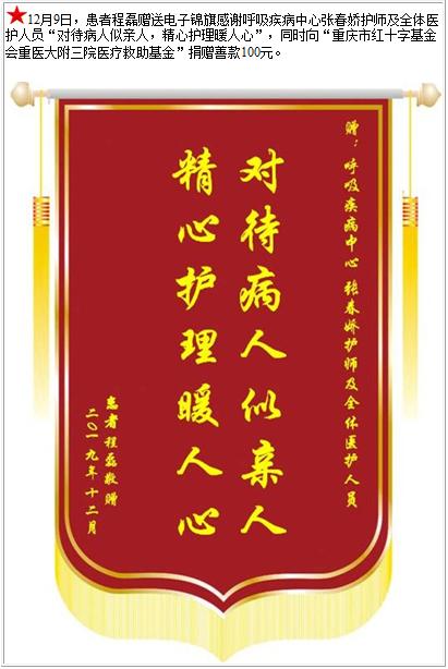 患者程磊赠送电子锦旗感谢呼吸疾病中心张春娇护师及全体医护人员,并向医疗救助基金捐赠善款100元-锦旗-患者心声-患者服务-重庆医科大学附属第三医院【官方网站】