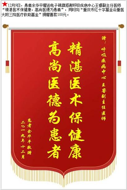 患者余华平赠送电子锦旗感谢呼吸疾病中心王睿副主任医师,并向医疗救助基金捐赠善款100元-锦旗-患者心声-患者服务-重庆医科大学附属第三医院【官方网站】