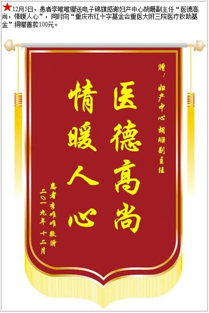 患者李唯唯赠送电子锦旗感谢妇产中心胡珊副主任,并向医疗救助基金捐赠善款100元-锦旗-患者心声-患者服务-重庆医科大学附属第三医院【官方网站】
