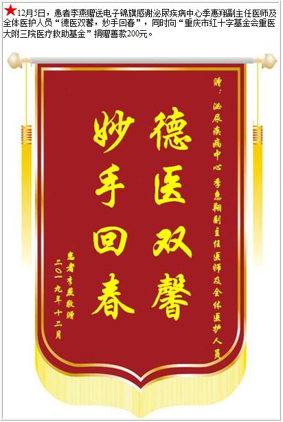 患者李燕赠送电子锦旗感谢泌尿疾病中心季惠翔副主任医师及全体医护人员,并向医疗救助基金捐赠善款200元-锦旗-患者心声-患者服务-重庆医科大学附属第三医院【官方网站】