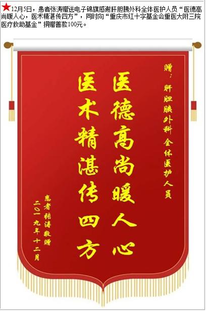 患者张涛赠送电子锦旗感谢肝胆胰外科全体医护人员,并向医疗救助基金捐赠善款100元-锦旗-患者心声-患者服务-重庆医科大学附属第三医院【官方网站】