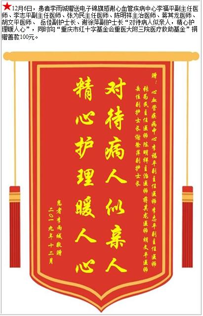 患者李雨城赠送电子锦旗感谢心血管疾病中心李福平副主任医师等人,并向医疗救助基金捐赠善款100元-锦旗-患者心声-患者服务-重庆医科大学附属第三医院【官方网站】