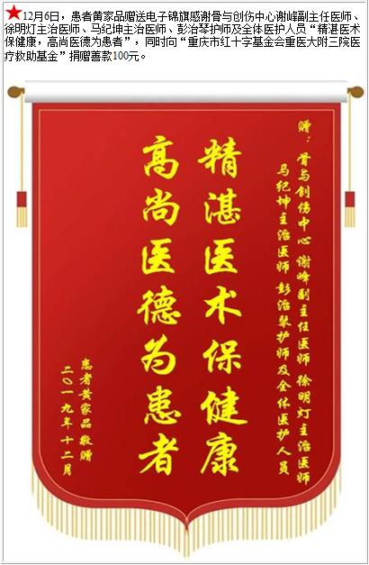 患者黄家品赠送电子锦旗感谢骨与创伤中心谢峰副主任医师等人及全体医护人员,并向医疗救助基金捐赠善款100元-锦旗-患者心声-患者服务-重庆医科大学附属第三医院【官方网站】
