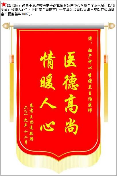 患者王思连赠送电子锦旗感谢妇产中心李绪兰主治医师,并向医疗救助基金捐赠善款100元-锦旗-患者心声-患者服务-重庆医科大学附属第三医院【官方网站】