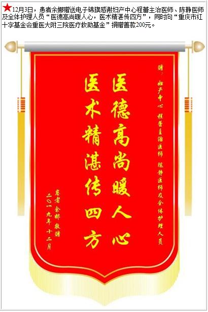 患者余娜赠送电子锦旗感谢妇产中心程蕾主治医师等人及全体护理人员,并向医疗救助基金捐赠善款200元-锦旗-患者心声-患者服务-重庆医科大学附属第三医院【官方网站】