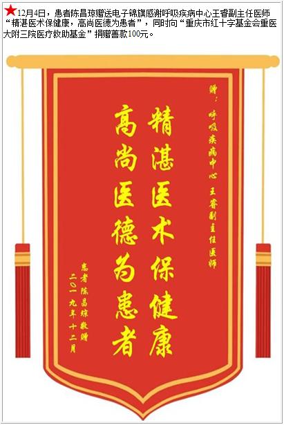 患者陈昌琼赠送电子锦旗感谢呼吸疾病中心王睿副主任医师,并向医疗救助基金捐赠善款100元-锦旗-患者心声-患者服务-重庆医科大学附属第三医院【官方网站】