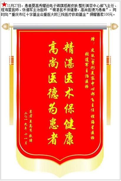 患者夏高秀赠送电子锦旗感谢皮肤/整形美容中心郝飞主任等人,并向医疗救助基金捐赠善款100元-锦旗-患者心声-患者服务-重庆医科大学附属第三医院【官方网站】