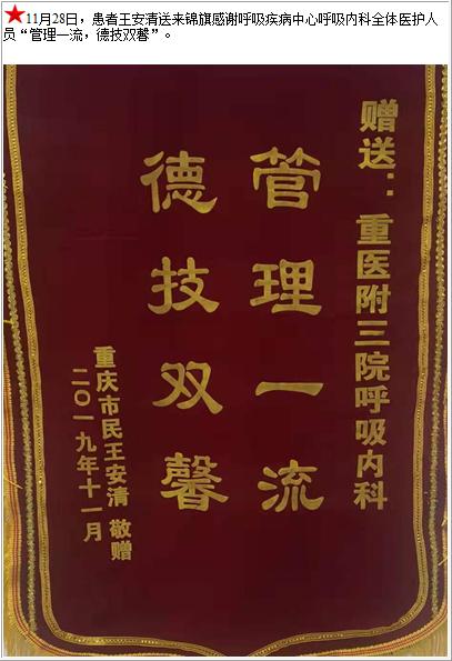 患者王安清送来锦旗感谢呼吸疾病中心呼吸内科全体医护人员“管理一流,德技双馨”-锦旗-患者心声-患者服务-重庆医科大学附属第三医院【官方网站】