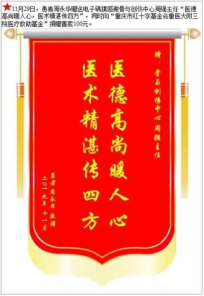 患者周永华赠送电子锦旗感谢骨与创伤中心周强主任,并向医疗救助基金捐赠善款100元-锦旗-患者心声-患者服务-重庆医科大学附属第三医院【官方网站】