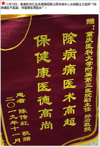 患者陈传红送来锦旗感谢泌尿疾病中心孙岩副主任医师“除病痛医术高超,保健康医德高尚”-锦旗-患者心声-患者服务-重庆医科大学附属第三医院【官方网站】