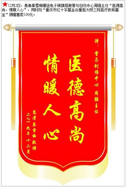 患者秦雪梅赠送电子锦旗感谢骨与创伤中心周强主任,并向医疗救助基金捐赠善款100元-锦旗-患者心声-患者服务-重庆医科大学附属第三医院【官方网站】