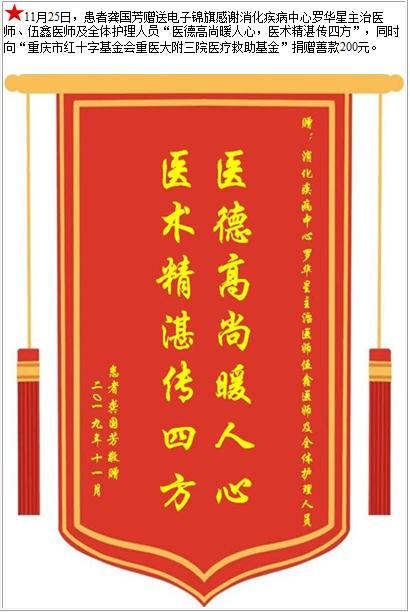 患者龚国芳赠送电子锦旗感谢消化疾病中心罗华星主治医师等人及全体护理人员,并向医疗救助基金捐赠善款200元-锦旗-患者心声-患者服务-重庆医科大学附属第三医院【官方网站】
