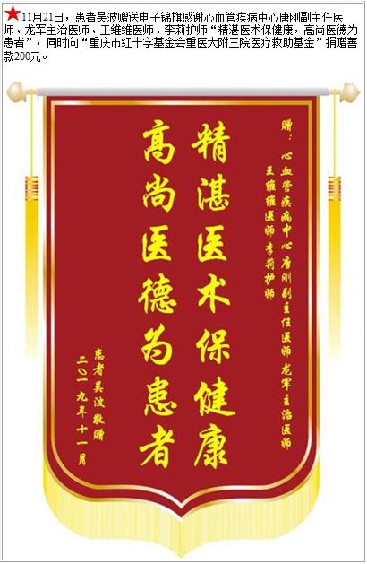 患者吴波赠送电子锦旗感谢心血管疾病中心唐刚副主任医师等人,并向医疗救助基金捐赠善款200元-锦旗-患者心声-患者服务-重庆医科大学附属第三医院【官方网站】