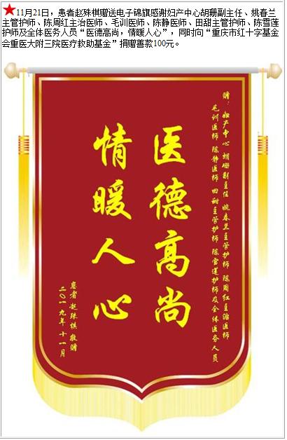 患者赵殊棋赠送电子锦旗感谢妇产中心胡珊副主任等人及全体医务人员,并向医疗救助基金捐赠善款100元-锦旗-患者心声-患者服务-重庆医科大学附属第三医院【官方网站】