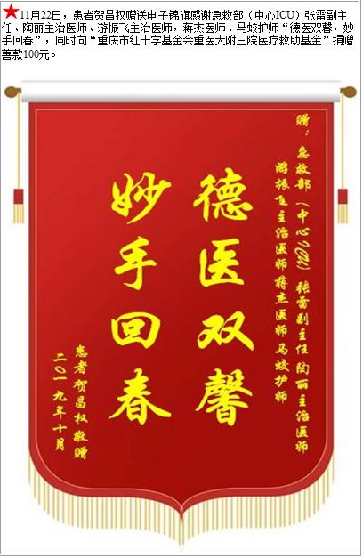 患者贺昌权赠送电子锦旗感谢急救部(中心ICU)张雷副主任等人,并向医疗救助基金捐赠善款100元-锦旗-患者心声-患者服务-重庆医科大学附属第三医院【官方网站】