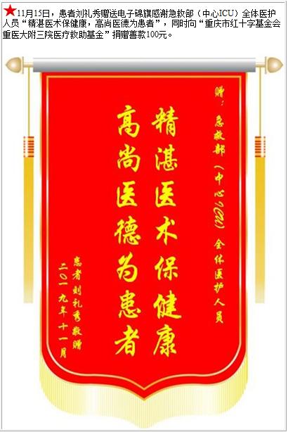 患者刘礼秀赠送电子锦旗感谢急救部(中心ICU)全体医护人员,并向医疗救助基金捐赠善款100元-锦旗-患者心声-患者服务-重庆医科大学附属第三医院【官方网站】