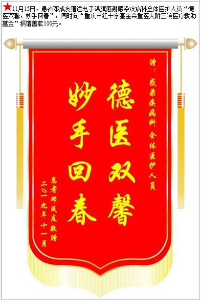 患者邓成友赠送电子锦旗感谢感染疾病科全体医护人员,并向医疗救助基金捐赠善款100元-锦旗-患者心声-患者服务-重庆医科大学附属第三医院【官方网站】