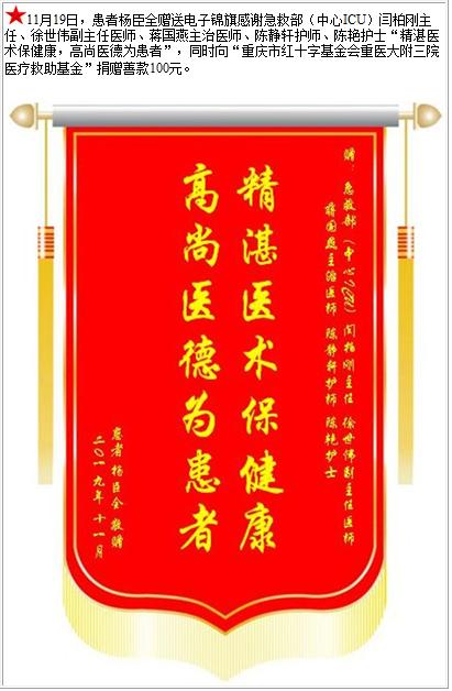 患者杨臣全赠送电子锦旗感谢急救部(中心ICU)闫柏刚主任等人,并向医疗救助基金捐赠善款100元-锦旗-患者心声-患者服务-重庆医科大学附属第三医院【官方网站】