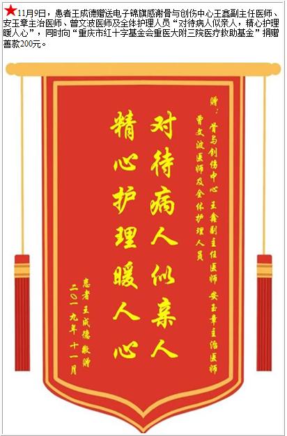 患者王成德赠送电子锦旗感谢骨与创伤中心王鑫副主任医师等人及全体护理人员,并向医疗救助基金捐赠善款200元-锦旗-患者心声-患者服务-重庆医科大学附属第三医院【官方网站】