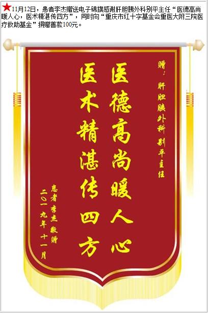 患者李杰赠送电子锦旗感谢肝胆胰外科别平主任,并向医疗救助基金捐赠善款100元-锦旗-患者心声-患者服务-重庆医科大学附属第三医院【官方网站】