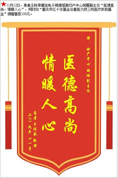 患者王陈承赠送电子锦旗感谢妇产中心胡珊副主任,并向医疗救助基金捐赠善款100元-锦旗-患者心声-患者服务-重庆医科大学附属第三医院【官方网站】