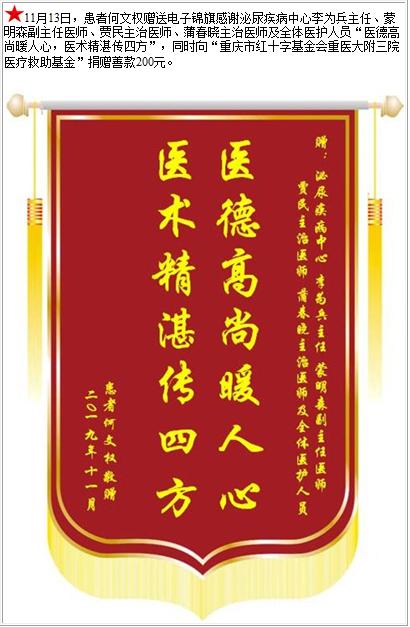 患者何文权赠送电子锦旗感谢泌尿疾病中心李为兵主任等人及全体医护人员,并向医疗救助基金捐赠善款200元-锦旗-患者心声-患者服务-重庆医科大学附属第三医院【官方网站】