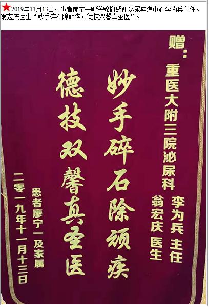 患者廖宁一赠送锦旗感谢泌尿疾病中心李为兵主任、翁宏庆医生“妙手碎石除顽疾,德技双馨真圣医”-锦旗-患者心声-患者服务-重庆医科大学附属第三医院【官方网站】