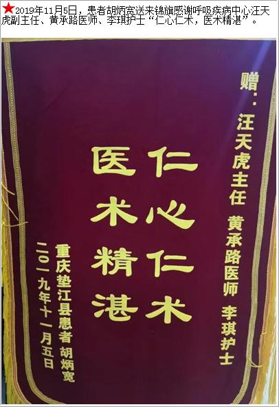 患者胡炳宽送来锦旗感谢呼吸疾病中心汪天虎副主任、黄承路医师、李琪护士“仁心仁术,医术精湛”-锦旗-患者心声-患者服务-重庆医科大学附属第三医院【官方网站】