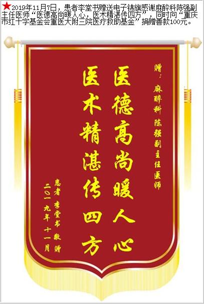 患者李堂书赠送电子锦旗感谢麻醉科陈强副主任医师,并向医疗救助基金捐赠善款100元-锦旗-患者心声-患者服务-重庆医科大学附属第三医院【官方网站】