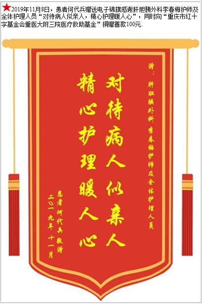 患者何代兵赠送电子锦旗感谢肝胆胰外科李春梅护师及全体护理人员,并向医疗救助基金捐赠善款100元-锦旗-患者心声-患者服务-重庆医科大学附属第三医院【官方网站】