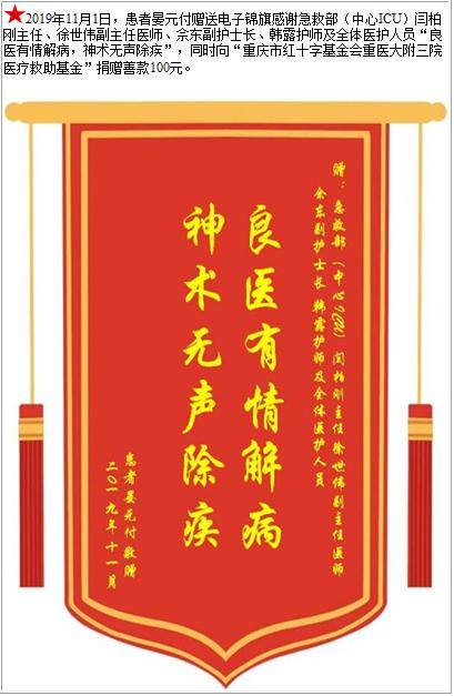 患者晏元付赠送电子锦旗感谢急救部(中心ICU)闫柏刚主任等人及全体医护人员,并向医疗救助基金捐赠善款100元-锦旗-患者心声-患者服务-重庆医科大学附属第三医院【官方网站】