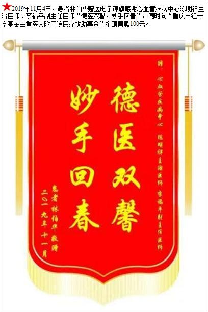 患者林伯华赠送电子锦旗感谢心血管疾病中心陈明祥主治医师等人,并向医疗救助基金捐赠善款100元-锦旗-患者心声-患者服务-重庆医科大学附属第三医院【官方网站】