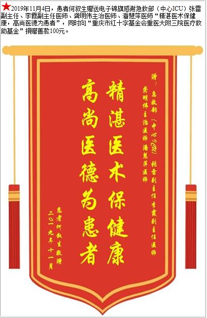患者何叙生赠送电子锦旗感谢急救部(中心ICU)张雷副主任等人,同时向医疗救助基金捐赠善款100元-锦旗-患者心声-患者服务-重庆医科大学附属第三医院【官方网站】