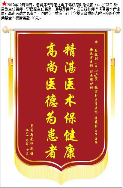 患者郑光琼赠送电子锦旗感谢急救部(中心ICU)张雷副主任医师等人,同时向“医疗救助基金”捐赠善款100元-锦旗-患者心声-患者服务-重庆医科大学附属第三医院【官方网站】
