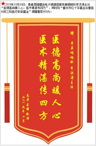 患者屈强赠送电子锦旗感谢耳鼻咽喉科李洪涛主任,同时向“医疗救助基金”捐赠善款600元-锦旗-患者心声-患者服务-重庆医科大学附属第三医院【官方网站】
