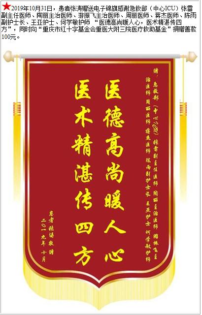 患者张涛赠送电子锦旗感谢急救部(中心ICU)张雷副主任医师等人 ,同时向“医疗救助基金”捐赠善款100元-锦旗-患者心声-患者服务-重庆医科大学附属第三医院【官方网站】