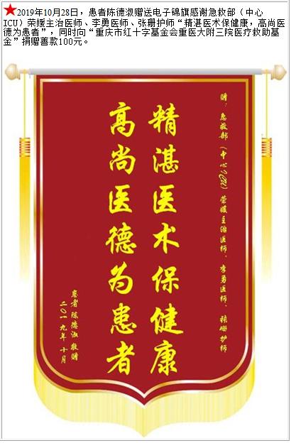 患者陈德淑赠送电子锦旗感谢急救部(中心ICU)荣媛主治医师等人,同时向“医疗救助基金”捐赠善款100元-锦旗-患者心声-患者服务-重庆医科大学附属第三医院【官方网站】