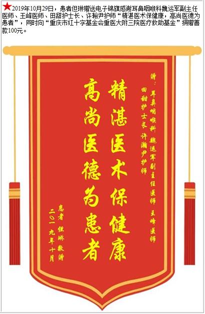患者但琳赠送电子锦旗感谢耳鼻咽喉科魏运军副主任医师等人,同时向“医疗救助基金”捐赠善款100元-锦旗-患者心声-患者服务-重庆医科大学附属第三医院【官方网站】