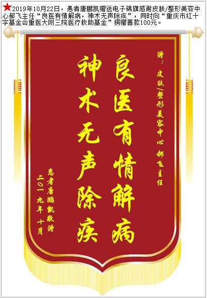 患者唐鹏凯赠送电子锦旗感谢皮肤/整形美容中心郝飞主任,同时向“医疗救助基金”捐赠善款100元-锦旗-患者心声-患者服务-重庆医科大学附属第三医院【官方网站】