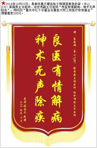患者张善太赠送电子锦旗感谢急救部蒋国燕主治医师、徐世伟副主任医师,同时向“医疗救助基金”捐赠善款200元-锦旗-患者心声-患者服务-重庆医科大学附属第三医院【官方网站】