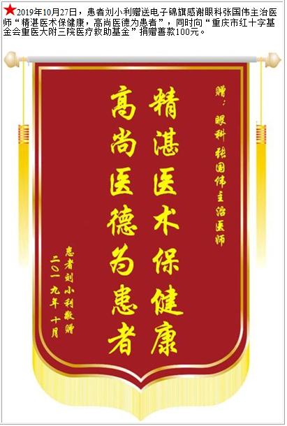 患者刘小利赠送电子锦旗感谢眼科张国伟主治医师,同时向“医疗救助基金”捐赠善款100元-锦旗-患者心声-患者服务-重庆医科大学附属第三医院【官方网站】