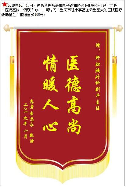 患者李思永送来电子锦旗感谢肝胆胰外科别平主任,同时向“医疗救助基金”捐赠善款100元-锦旗-患者心声-患者服务-重庆医科大学附属第三医院【官方网站】
